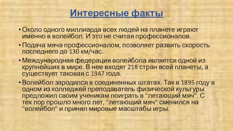 Интересные фактыОколо одного миллиарда всех людей на планете играют именно в волейбол. И это не считая профессионалов.Подача