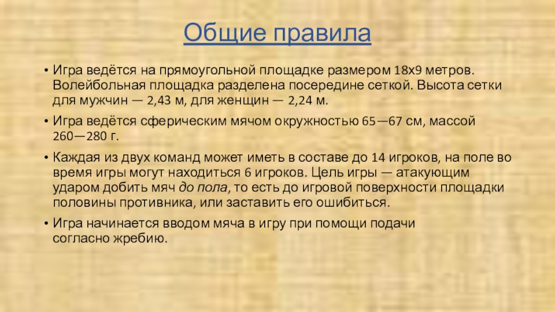 Общие правилаИгра ведётся на прямоугольной площадке размером 18х9 метров. Волейбольная площадка разделена посередине сеткой. Высота сетки для мужчин — 2,43 м,