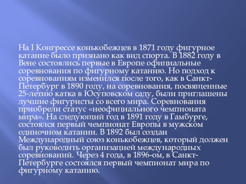 Слайд 3На I Конгрессе конькобежцев в 1871 году фигурное катание было признано