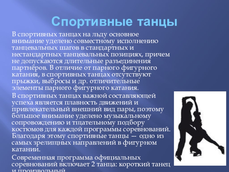 танцевальных шагов в стандартных и нестандартных танцевальных позициях, причем не допускаются длительные разъединения партнёров. В отличие от парного фигурного катания, в спортивных танцах отсутствуют прыжки, выбросы и др. отличительные элементы парного фигурного катания.