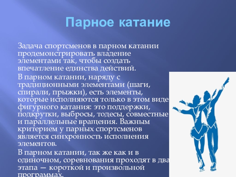 Задача спортсменов в парном катании продемонстрировать владение элементами так, чтобы