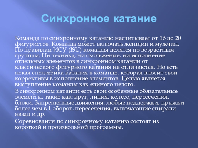 Команда может включать женщин и мужчин. По правилам ИСУ (ISU) команды делятся по возрастным группам. Ни техника, ни скольжение, ни исполнение отдельных элементов в синхронном катании от классического фигурного катания не отличаются. Но есть некая специфика катания в команде, которая вносит свои коррективы в исполнение элементов. Целью является выступление команды как единого целого.