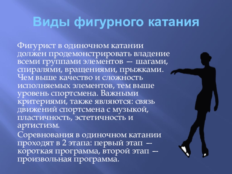 элементов — шагами, спиралями, вращениями, прыжками. Чем выше качество и сложность исполняемых элементов, тем выше уровень спортсмена. Важными критериями, также являются: связь движений спортсмена с музыкой, пластичность, эстетичность и артистизм.