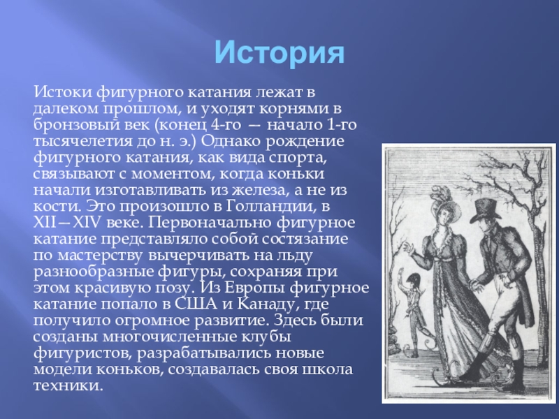 бронзовый век (конец 4-го — начало 1-го тысячелетия до н. э.) Однако рождение фигурного катания, как вида спорта, связывают с моментом, когда коньки начали изготавливать из железа, а не из кости. Это произошло в Голландии, в XII—XIV веке. Первоначально фигурное катание представляло собой состязание по мастерству вычерчивать на льду разнообразные фигуры, сохраняя при этом красивую позу. Из Европы фигурное катание попало в США и Канаду, где получило огромное развитие. Здесь были созданы многочисленные клубы фигуристов, разрабатывались новые модели коньков, создавалась своя школа техники.