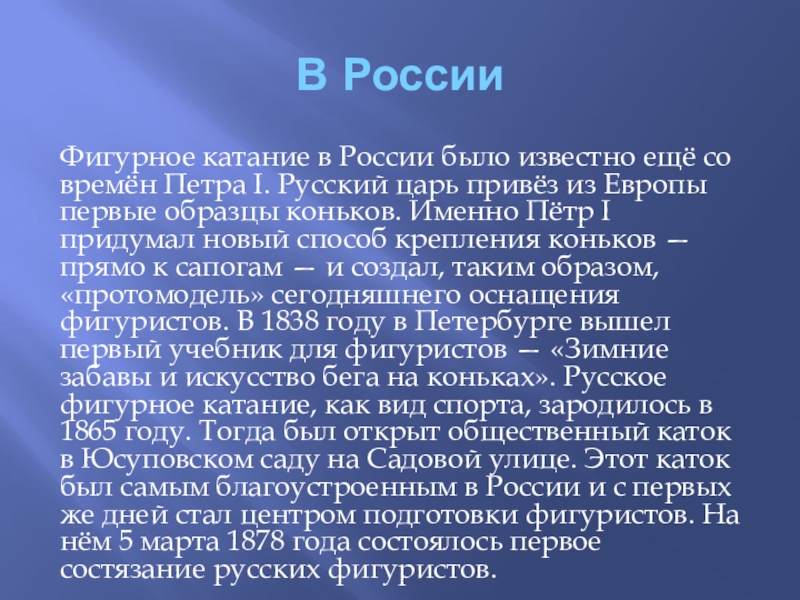 I. Русский царь привёз из Европы первые образцы коньков. Именно Пётр I придумал новый способ крепления коньков — прямо к сапогам — и создал, таким образом, «протомодель» сегодняшнего оснащения фигуристов. В 1838 году в Петербурге вышел первый учебник для фигуристов — «Зимние забавы и искусство бега на коньках». Русское фигурное катание, как вид спорта, зародилось в 1865 году. Тогда был открыт общественный каток в Юсуповском саду на Садовой улице. Этот каток был самым благоустроенным в России и с первых же дней стал центром подготовки фигуристов. На нём 5 марта 1878 года состоялось первое состязание русских фигуристов.