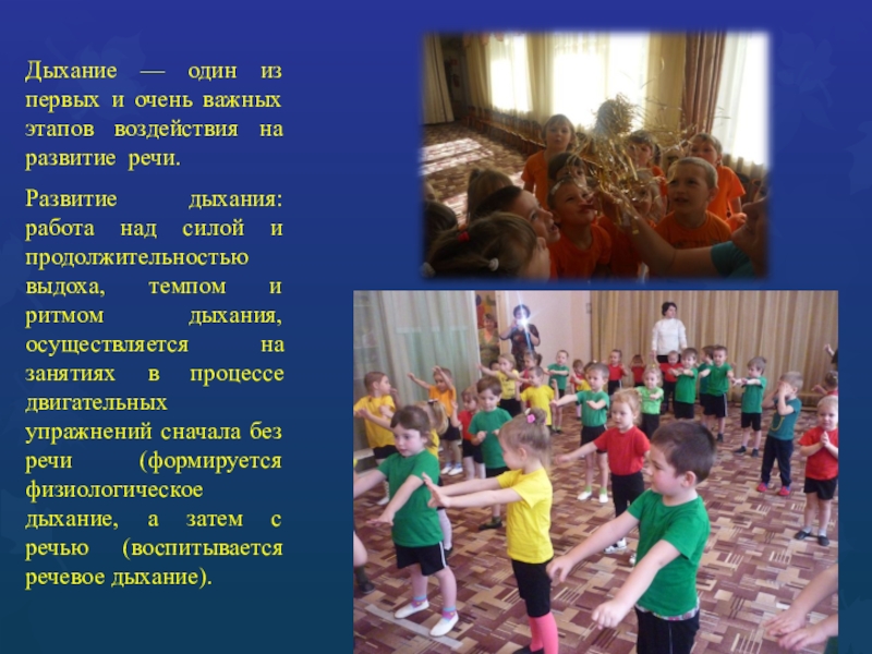 Развитие дыхания: работа над силой и продолжительностью выдоха, темпом и ритмом дыхания, осуществляется на занятиях в процессе двигательных упражнений сначала без речи (формируется физиологическое дыхание, а затем с речью (воспитывается речевое дыхание).