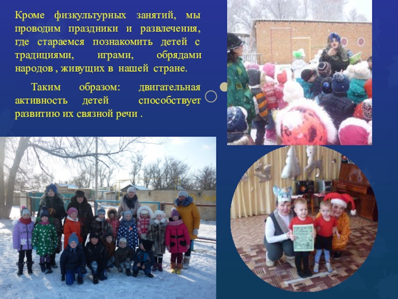 Слайд 13Кроме физкультурных занятий, мы проводим праздники и развлечения, где стараемся познакомить