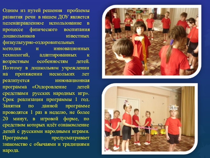 целенаправленное использование в процессе физического воспитания дошкольников известных физкультурно-оздоровительных методик и инновационных технологий, адаптированных к возрастным особенностям детей. Поэтому в дошкольном учреждении на протяжении нескольких лет реализуется инновационная программа «Оздоровление детей средствами русских народных игр». Срок реализации программы 1 год. Занятия по данной программе проводятся 1 раз в неделю, не более 20 минут, в игровой форме, по средством которых идёт ознакомление детей с русскими народными играми. Программа предусматривает знакомство с обычаями и традициями народа.