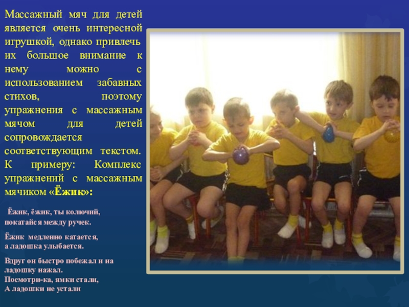большое внимание к нему можно с использованием забавных стихов, поэтому упражнения с массажным мячом для детей сопровождается соответствующим текстом. К примеру: Комплекс упражнений с массажным мячиком «Ёжик»: