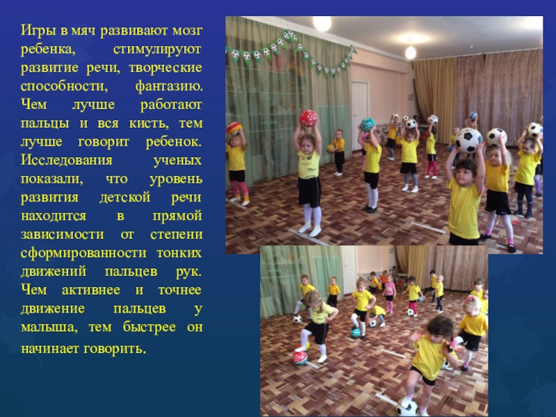 Слайд 5Игры в мяч развивают мозг ребенка, стимулируют развитие речи, творческие способности,