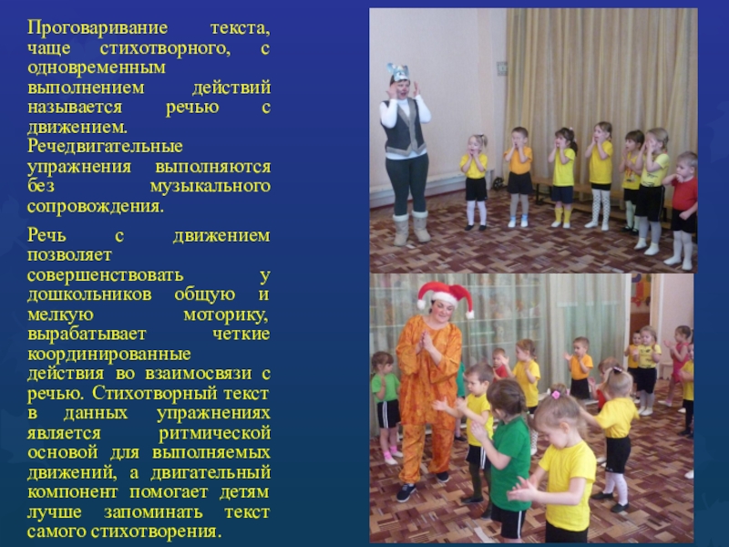 Речь с движением позволяет совершенствовать у дошкольников общую и мелкую моторику, вырабатывает четкие координированные действия во взаимосвязи с речью. Стихотворный текст в данных упражнениях является ритмической основой для выполняемых движений, а двигательный компонент помогает детям лучше запоминать текст самого стихотворения.