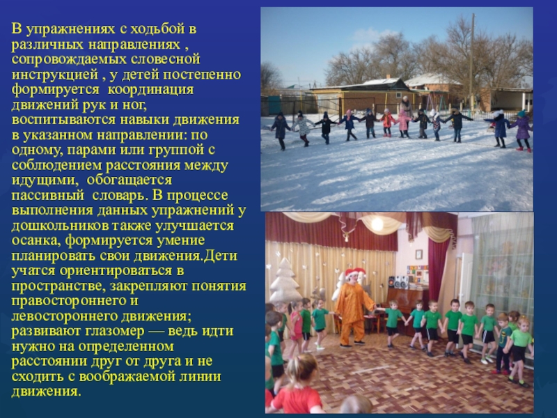 Слайд 3В упражнениях с ходьбой в различных направлениях , сопровождаемых словесной инструкцией