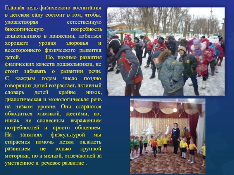 удовлетворяя естественную биологическую потребность дошкольников в движении, добиться хорошего уровня здоровья и всестороннего физического развития детей. Но, помимо развития физических качеств дошкольников, не стоит забывать о развитии речи. С каждым годом число поздно говорящих детей возрастает, активный словарь детей крайне низок, диалогическая и монологическая речь на низком уровне. Они стараются обходиться мимикой, жестами, но, никак не словесным выражением потребностей и просто общением. На занятиях физкультурой мы стараемся помочь детям овладеть развитием не только крупной моторики, но и мелкой, отвечающей за умственное и речевое развитие .