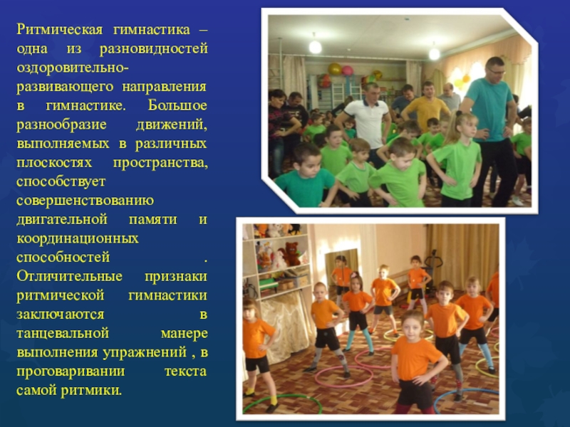 разнообразие движений, выполняемых в различных плоскостях пространства, способствует совершенствованию двигательной памяти и координационных способностей . Отличительные признаки ритмической гимнастики заключаются в танцевальной манере выполнения упражнений , в проговаривании текста самой ритмики.