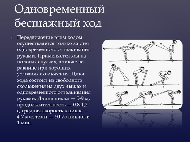 руками. Применяется ход на пологих спусках, а также на равнине при хороших условиях скольжения. Цикл хода состоит из свободного скольжения на двух лыжах и одновременного отталкивания руками. Длина цикла — 5-9 м, продолжительность — 0,8-1,2 с, средняя скорость в цикле — 4-7 м/с, темп — 50-75 циклов в 1 мин.