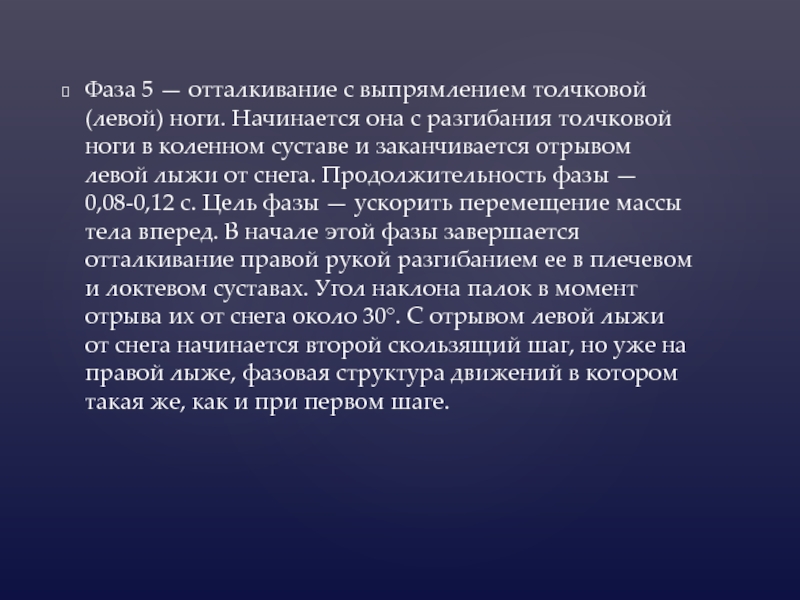с разгибания толчковой ноги в коленном суставе и заканчивается отрывом левой лыжи от снега. Продолжительность фазы — 0,08-0,12 с. Цель фазы — ускорить перемещение массы тела вперед. В начале этой фазы завершается отталкивание правой рукой разгибанием ее в плечевом и локтевом суставах. Угол наклона палок в момент отрыва их от снега около 30°. С отрывом левой лыжи от снега начинается второй скользящий шаг, но уже на правой лыже, фазовая структура движений в котором такая же, как и при первом шаге.