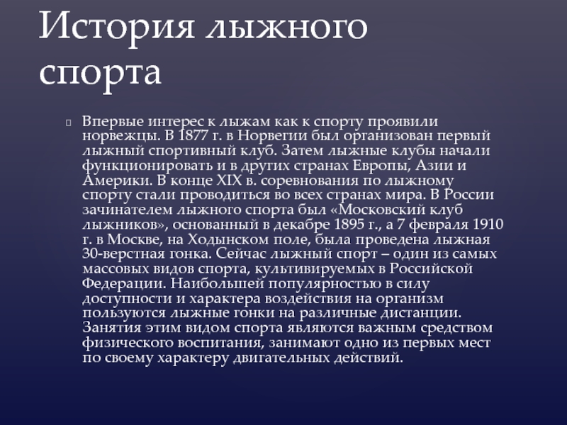 г. в Норвегии был организован первый лыжный спортивный клуб. Затем лыжные клубы начали функционировать и в других странах Европы, Азии и Америки. В конце XIX в. соревнования по лыжному спорту стали проводиться во всех странах мира. В России зачинателем лыжного спорта был «Московский клуб лыжников», основанный в декабре 1895 г., а 7 февраля 1910 г. в Москве, на Ходынском поле, была проведена лыжная 30-верстная гонка. Сейчас лыжный спорт – один из самых массовых видов спорта, культивируемых в Российской Федерации. Наибольшей популярностью в силу доступности и характера воздействия на организм пользуются лыжные гонки на различные дистанции. Занятия этим видом спорта являются важным средством физического воспитания, занимают одно из первых мест по своему характеру двигательных действий.