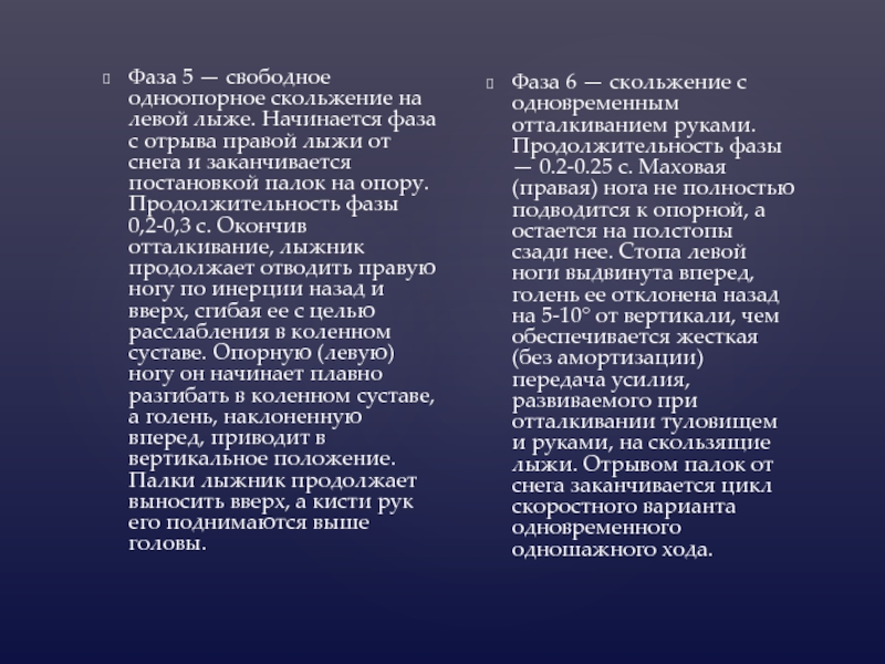 Фаза 6 — скольжение с одновременным отталкиванием руками. Продолжительность фазы — 0.2-0.25 с. Маховая (правая) нога не полностью подводится к опорной, а остается на полстопы сзади нее. Стопа левой ноги выдвинута вперед, голень ее отклонена назад на 5-10° от вертикали, чем обеспечивается жесткая (без амортизации) передача усилия, развиваемого при отталкивании туловищем и руками, на скользящие лыжи. Отрывом палок от снега заканчивается цикл скоростного варианта одновременного одношажного хода.