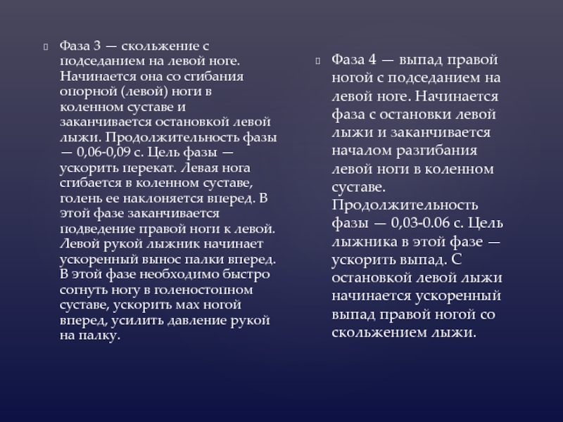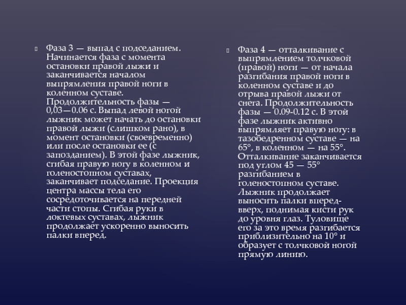 правой лыжи и заканчивается началом выпрямления правой ноги в коленном суставе. Продолжительность фазы — 0,03—0.06 с. Выпад левой ногой лыжник может начать до остановки правой лыжи (слишком рано), в момент остановки (своевременно) или после остановки ее (с запозданием). В этой фазе лыжник, сгибая правую ногу в коленном и голеностопном суставах, заканчивает подседание. Проекция центра массы тела его сосредоточивается на передней части стопы. Сгибая руки в локтевых суставах, лыжник продолжает ускоренно выносить палки вперед.