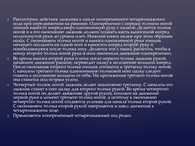 равнине. Одновременно с первым толчком ногой гонщик выносит вперед-вверх одноименную руку с палкой. Делается толчок ногой и к его окончанию лыжник должен поднять кисть выносимой вперед полусогнутой руки до уровня плеч. Нижний конец палки при этом обращен назад. С окончанием толчка ногой и выноса одноименной руки гонщик начинает скользить на одной ноге и выносить вперед вторую руку и освободившуюся после толчка ногу. Делается эти с таким расчетом, чтобы к концу второго толчка ногой рука и нога закончили движение одновременно.