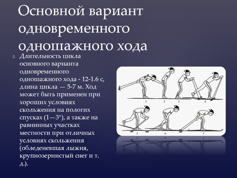 и отличных условиях скольжения. Цикл одновременного двухшажного хода состоит из двух скользящих шагов, одновременного отталкивания руками и свободного скольжения на двух лыжах. Продолжительность цикла — 1,7-2,1 с, длина — 8-10 м, средняя скорость — 5,0-6,5 м/с.