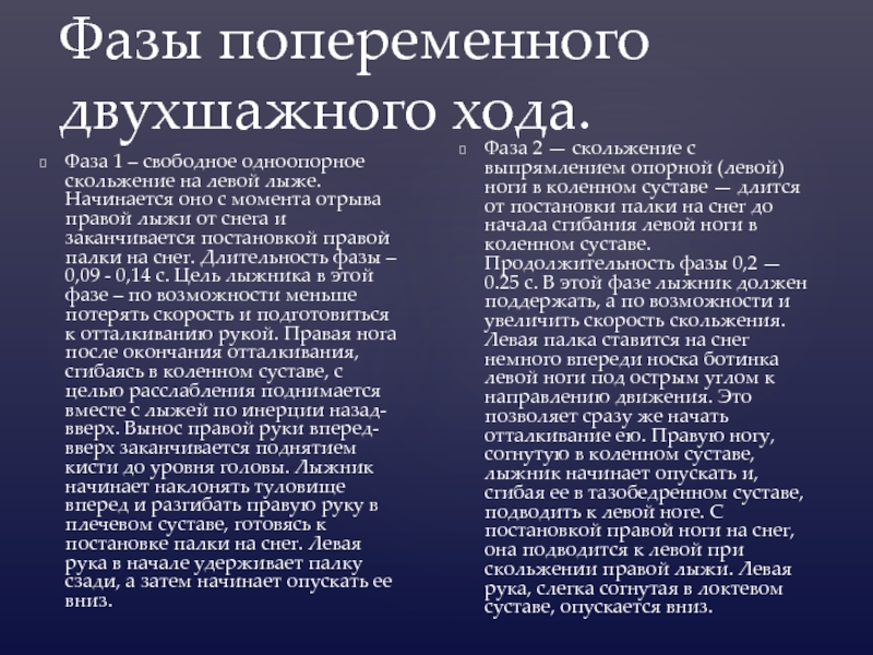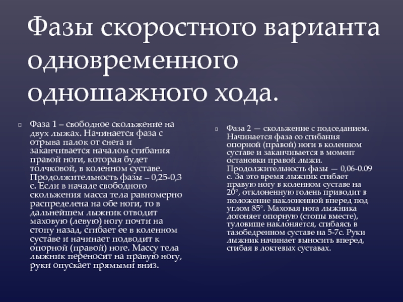 двух лыжах. Начинается фаза с отрыва палок от снега и заканчивается началом сгибания правой ноги, которая будет толчковой, в коленном суставе. Продолжительность фазы – 0,25-0,3 с. Если в начале свободного скольжения масса тела равномерно распределена на обе ноги, то в дальнейшем лыжник отводит маховую (левую) ногу почти на стопу назад, сгибает ее в коленном суставе и начинает подводит к опорной (правой) ноге. Массу тела лыжник переносит на правую ногу, руки опускает прямыми вниз.