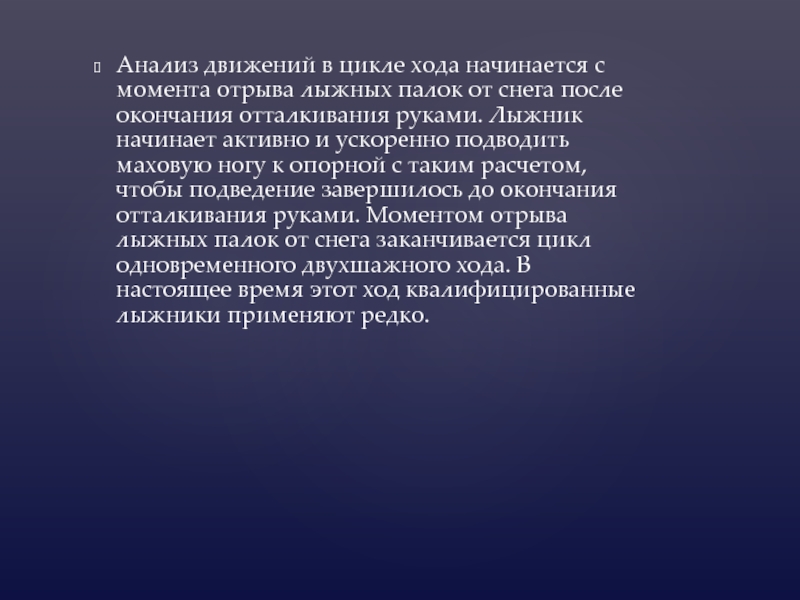 Слайд 18Анализ движений в цикле хода начинается с момента отрыва лыжных палок