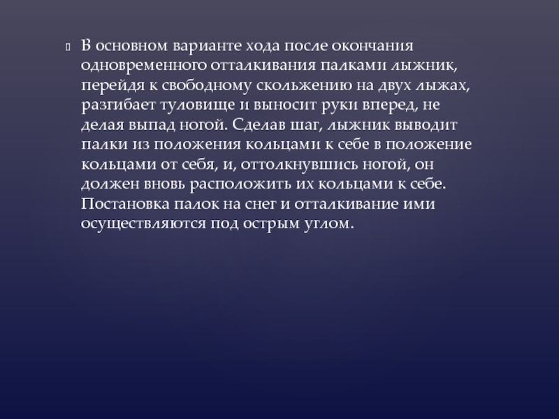 к свободному скольжению на двух лыжах, разгибает туловище и выносит руки вперед, не делая выпад ногой. Сделав шаг, лыжник выводит палки из положения кольцами к себе в положение кольцами от себя, и, оттолкнувшись ногой, он должен вновь расположить их кольцами к себе. Постановка палок на снег и отталкивание ими осуществляются под острым углом.