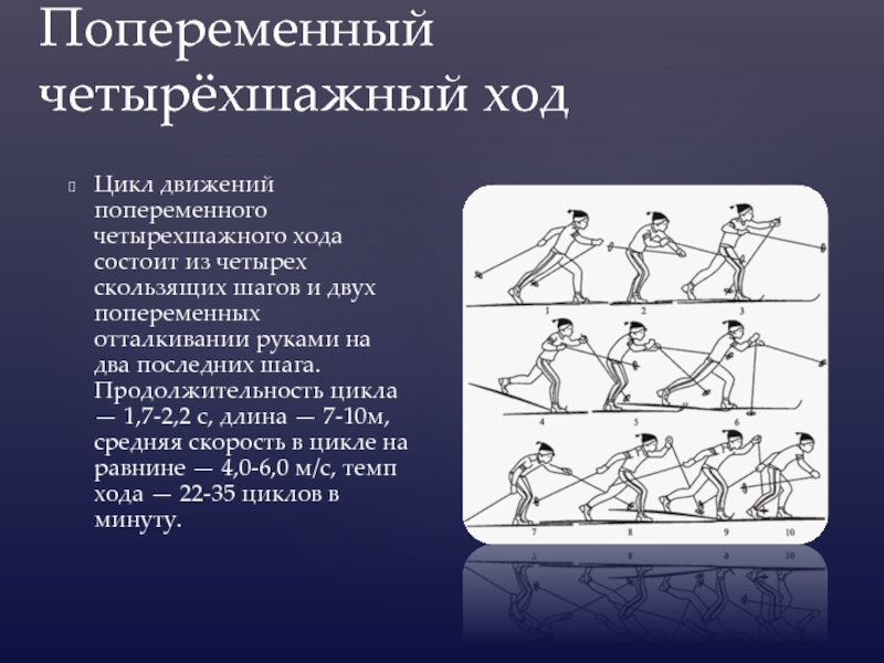 Цикл движений попеременного четырехшажного хода состоит из четырех скользящих