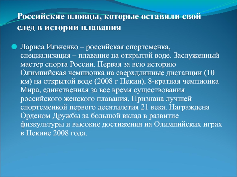 Лариса Ильченко – российская спортсменка, специализация – плавание на открытой воде. Заслуженный