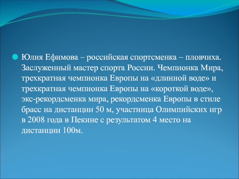 Юлия Ефимова – российская спортсменка – пловчиха. Заслуженный мастер спорта России. Чемпионка