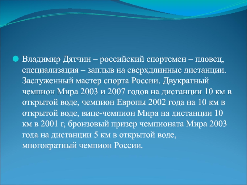 Владимир Дятчин – российский спортсмен – пловец, специализация – заплыв на сверхдлинные