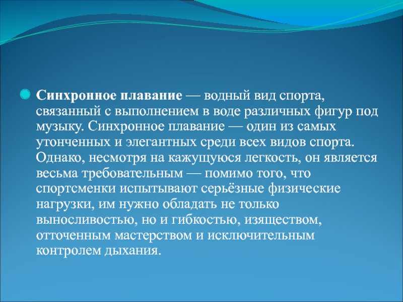 фигур под музыку. Синхронное плавание — один из самых утонченных и элегантных среди всех видов спорта. Однако, несмотря на кажущуюся легкость, он является весьма требовательным — помимо того, что спортсменки испытывают серьёзные физические нагрузки, им нужно обладать не только выносливостью, но и гибкостью, изяществом, отточенным мастерством и исключительным контролем дыхания.