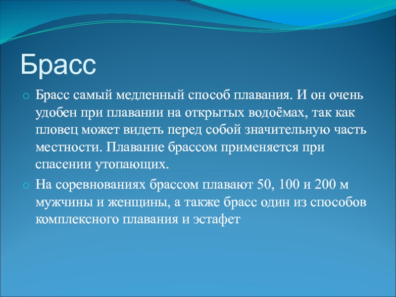 Брасс самый медленный способ плавания. И он очень удобен при плавании на