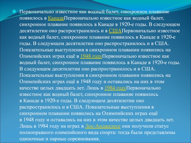 водный балет, синхронное плавание появилось в Канаде в 1920-е годы. В следующем десятилетии оно распространилось и в СШАПервоначально известное как водный балет, синхронное плавание появилось в Канаде в 1920-е годы. В следующем десятилетии оно распространилось и в США. Показательные выступления в синхронном плавании появились на Олимпийских играх ещё в 1948 годуПервоначально известное как водный балет, синхронное плавание появилось в Канаде в 1920-е годы. В следующем десятилетии оно распространилось и в США. Показательные выступления в синхронном плавании появились на Олимпийских играх ещё в 1948 году и оставались на них в этом качестве целых двадцать лет. Лишь в 1984 годуПервоначально известное как водный балет, синхронное плавание появилось в Канаде в 1920-е годы. В следующем десятилетии оно распространилось и в США. Показательные выступления в синхронном плавании появились на Олимпийских играх ещё в 1948 году и оставались на них в этом качестве целых двадцать лет. Лишь в 1984 году на играх в Лос-Анджелесе они получили статус полноправного олимпийского вида спорта: тогда были представлены одиночные и парные соревнования.