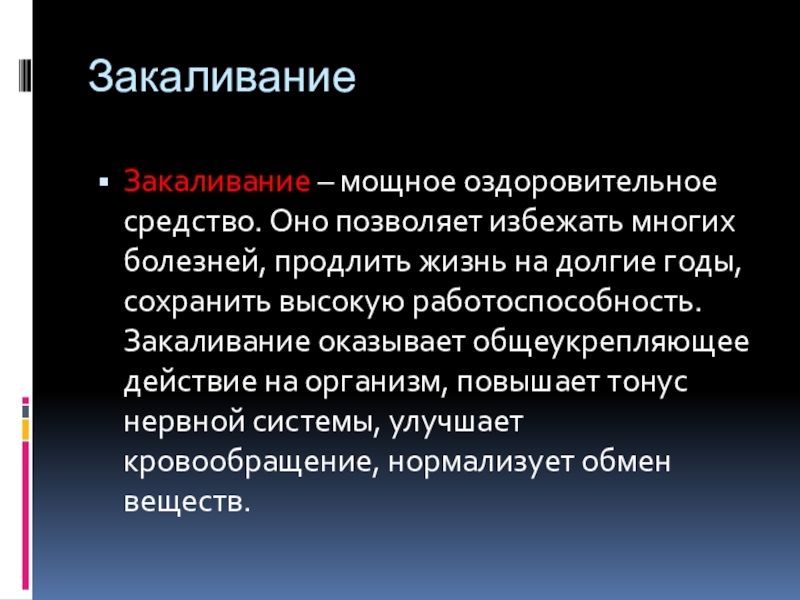 на долгие годы, сохранить высокую работоспособность. Закаливание оказывает общеукрепляющее действие на организм, повышает тонус нервной системы, улучшает кровообращение, нормализует обмен веществ.