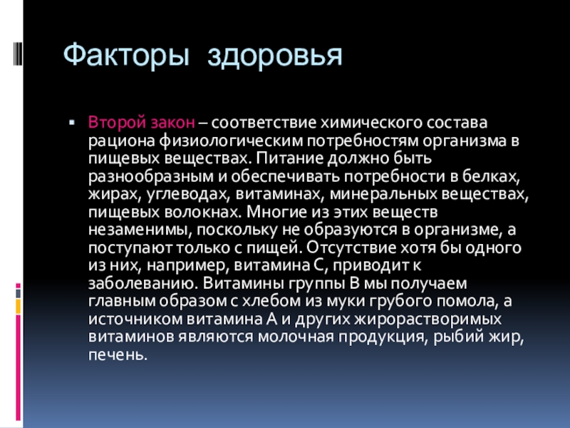 пищевых веществах. Питание должно быть разнообразным и обеспечивать потребности в белках, жирах, углеводах, витаминах, минеральных веществах, пищевых волокнах. Многие из этих веществ незаменимы, поскольку не образуются в организме, а поступают только с пищей. Отсутствие хотя бы одного из них, например, витамина С, приводит к заболеванию. Витамины группы В мы получаем главным образом с хлебом из муки грубого помола, а источником витамина А и других жирорастворимых витаминов являются молочная продукция, рыбий жир, печень.