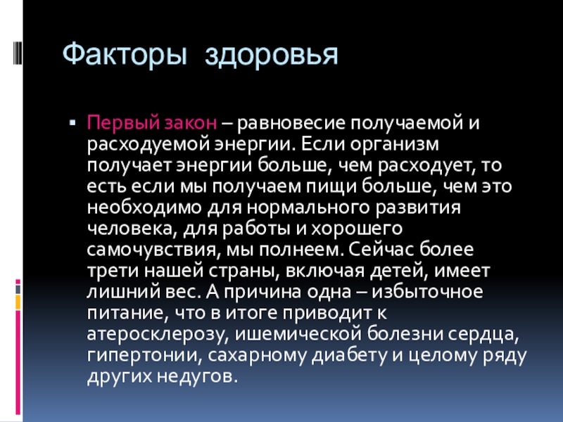 энергии больше, чем расходует, то есть если мы получаем пищи больше, чем это необходимо для нормального развития человека, для работы и хорошего самочувствия, мы полнеем. Сейчас более трети нашей страны, включая детей, имеет лишний вес. А причина одна – избыточное питание, что в итоге приводит к атеросклерозу, ишемической болезни сердца, гипертонии, сахарному диабету и целому ряду других недугов.