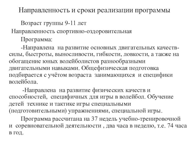 -Направлена на развитие физических качеств и способностей, специфичных для игры в волейбол. Обучение детей технике и тактике игры специальными (подготовительными) упражнениями, специальной игры.