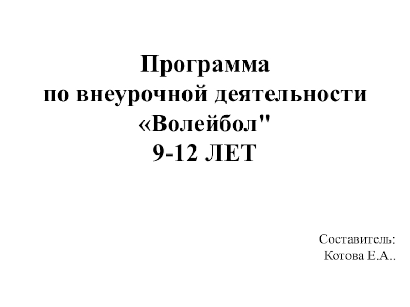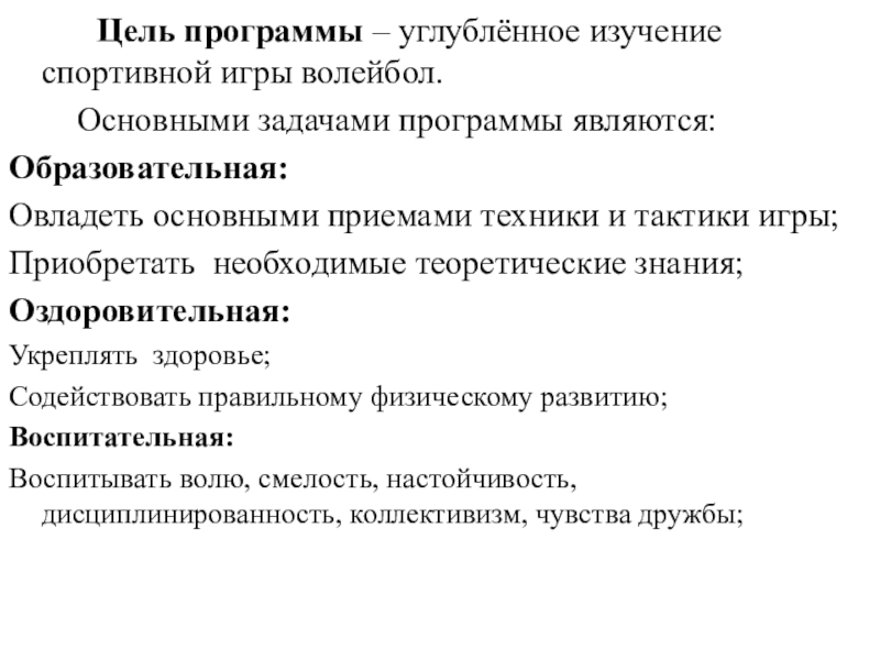 Слайд 3 Цель программы – углублённое изучение спортивной игры волейбол.