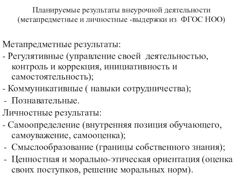 Слайд 5Планируемые результаты внеурочной деятельности (метапредметные и личностные -выдержки из ФГОС НОО)