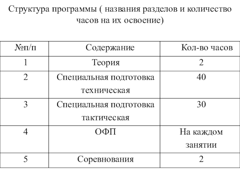Слайд 8Структура программы ( названия разделов и количество часов на их освоение)
