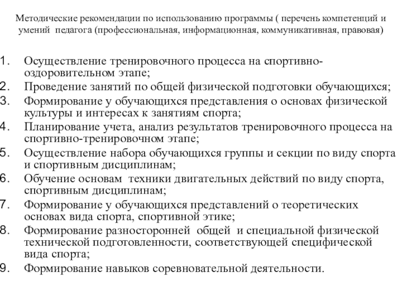 Слайд 14Методические рекомендации по использованию программы ( перечень компетенций и умений педагога