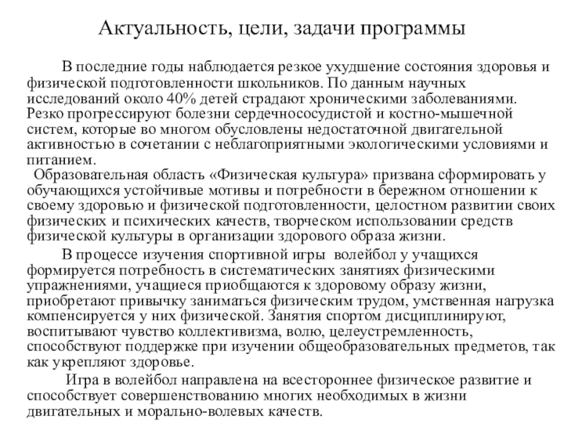 и физической подготовленности школьников. По данным научных исследований около 40% детей страдают хроническими заболеваниями. Резко прогрессируют болезни сердечнососудистой и костно-мышечной систем, которые во многом обусловлены недостаточной двигательной активностью в сочетании с неблагоприятными экологическими условиями и питанием.