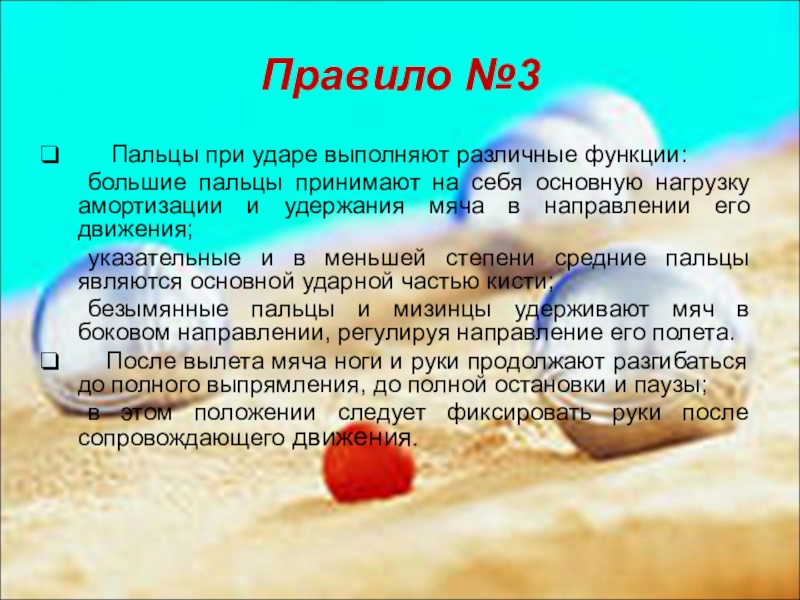 Удар по мячу резкий, без сопровождения; пальцы обхватывают мяч.