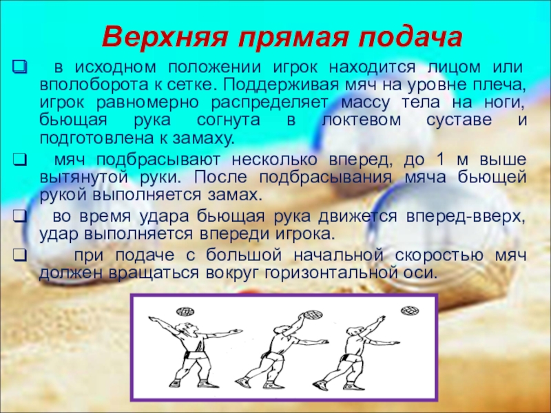 мяч подбрасывают несколько вперед, до 1 м выше вытянутой руки. После подбрасывания мяча бьющей рукой выполняется замах.