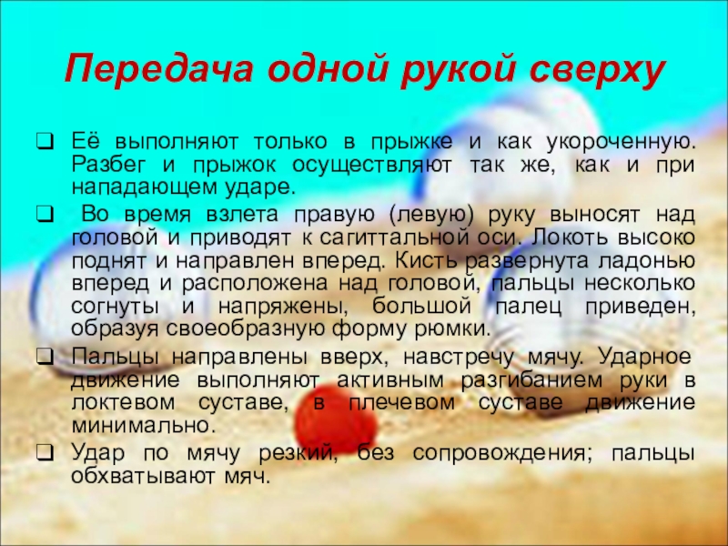 Пальцы направлены вверх, навстречу мячу. Ударное движение выполняют активным разгибанием руки в локтевом суставе, в плечевом суставе движение минимально.