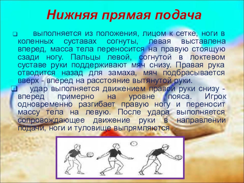 Несколько позже в движение включают руки: разгибаясь в локтевых суставах, они задают общее направление полету мяча при передаче.