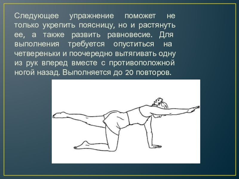 Слайд 19Следующее упражнение поможет не только укрепить поясницу, но и растянуть ее,