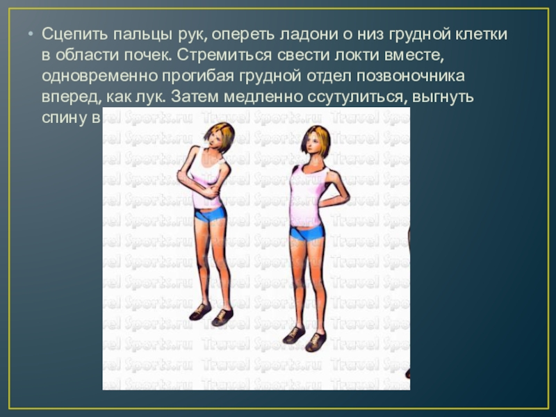 почек. Стремиться свести локти вместе, одновременно прогибая грудной отдел позвоночника вперед, как лук. Затем медленно ссутулиться, выгнуть спину в обратном направлении.
